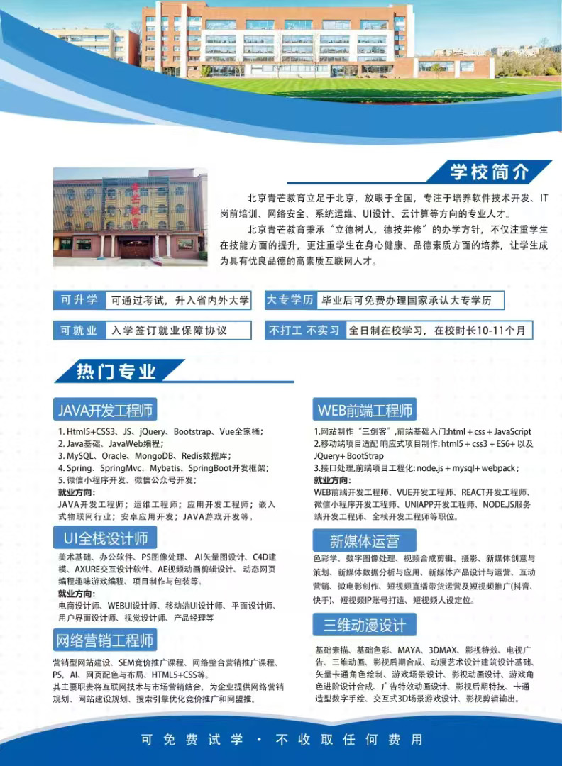 北京青芒教育石家庄校区,本着尊重人才,崇尚技能,既能实现高薪就业,又能实现高考升学的办学宗旨面向社会招生。