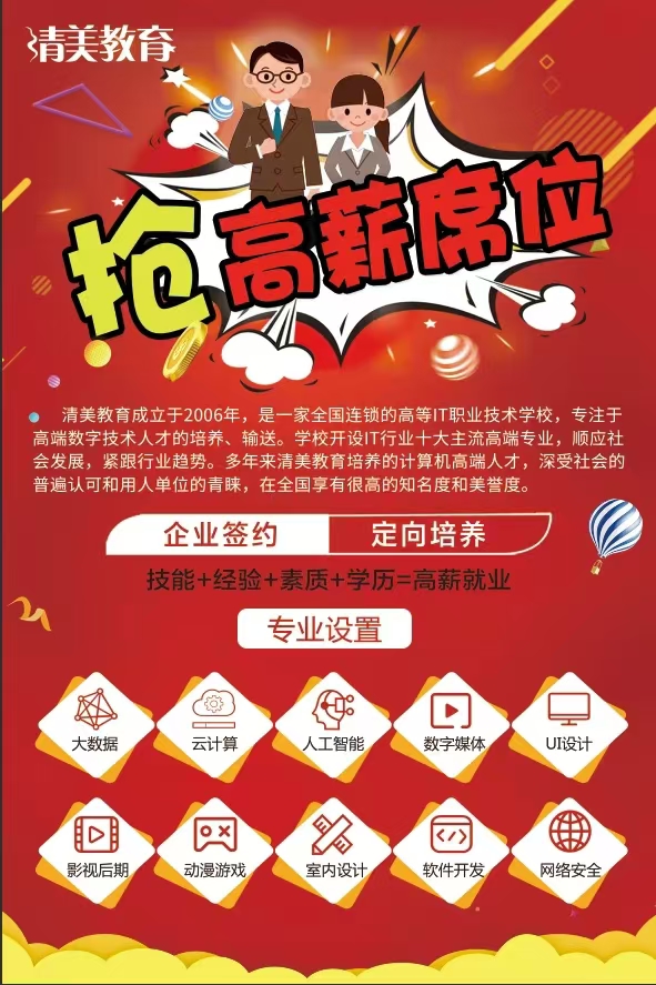 清美教育是一家IT教育院校,成立于2006年,开设有十来个IT互联网行业热门专业,云计算,大数据,软件开发,网络工程,人工智能,数字媒体,影视后期,动漫游戏,建筑表现,虚拟现实等!