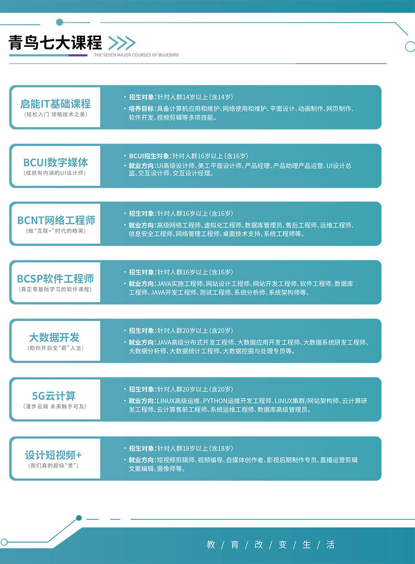 专业为15岁以上人群提供全日制IT课程教育,开设的课程包含了软件开发(BCSP8.0)、网络工程(BENET6.0)、视频特效(BCVE)、UI设计(BCUI)和启蒙星3.0。