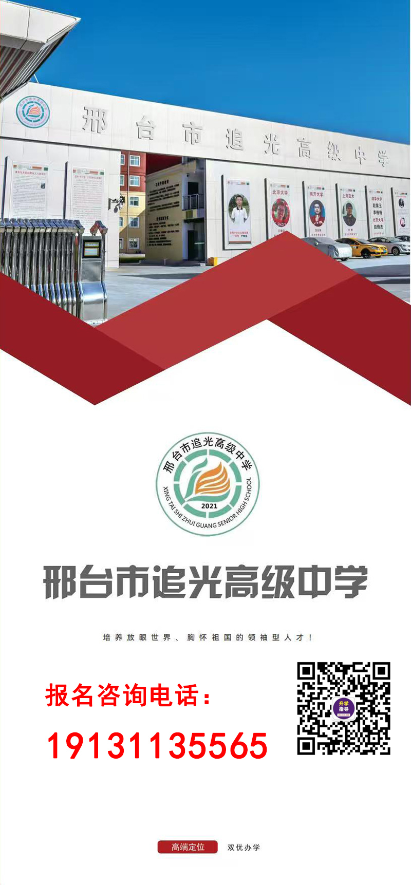 邢台市追光高级中学位于邢台市襄都区风景如画的七里河北岸,是民进河北省委委员、邢台市人大代表、民进中央全国脱贫攻坚民主监督工作先进个人、邢台市追光教育集团董事长梁宏志先生带领集团精心打造的,在邢台市委、市政府、市教育局、市审批局、襄都区区委、区政府、区教育局大力支持下,按照省级示范性高中打造的私立高级中学。学校奉行“以学生为中心,以奋斗者为本”的价值观。